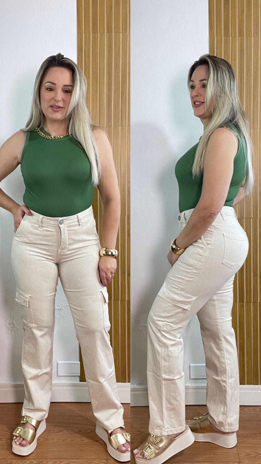 Possui bolsos cargo laterais funcionais, cintura média e fechamento frontal com zíper e botão. O caimento é soltinho, com toque macio e confortável, ideal para usar em looks casuais, trabalho ou até em produções mais arrumadas.